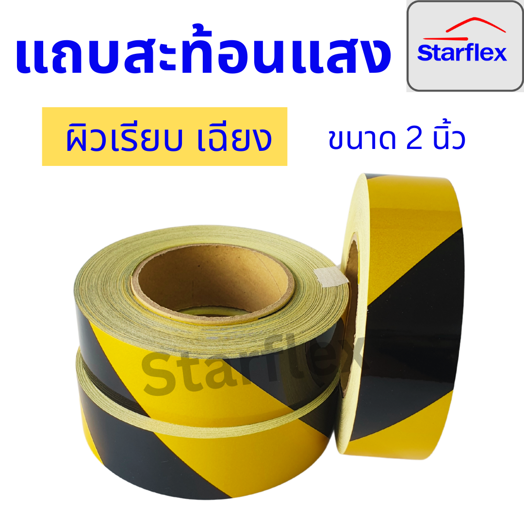 Starflex สติ๊กเกอร์สะท้อนแสง เทปสะท้อนแสง เทปกาวตีเส้น One Step Reflective Tape ลายเฉียงสีเหลือง-ดำ คุณสมบัติ / จุดเด่น 1. เนื้อเทปเป็น PVC กาวยางอย่างดี ติดแน่น ไม่ลอก ทำความสะอาดได้ง่าย ทนทานต่อการใช้งาน เทปตีเส้น นิยมนำไปใช้ประโยชน์อะไรได้บ้าง? 1. สามารถติดบนพื้นโรงงานเพื่อแบ่งเขตไลน์การผลิต หรือ แบ่งเป็นลู่ทางเดิน 2. สามารถติดพื้นเพื่อบ่งบอกพื้นที่เขตอันตราย, จุดติดตั้งอุปกรณ์ดับเพลิง, เขตห้ามเข้า หรือเขตห้ามวางสิ่งของขวางทางเข้าออก 3. สามารถนำไปติดบนกำแพง, จุดขนส่งสินค้า เพื่อให้สังเกตุได้ง่าย และป้องกันการชน 4. สามารถติดรถขนส่ง เพื่อลดอุบัติเหตุ ทำให้เห็นได้ชัดในเวลากลางคืน 5. นิยมใช้ติดตามพื้นที่ต่างๆ เพื่อเป็นการเตือน หรือ แจ้งเตือน คำแนะนำ 1. ทำความสะอาดพื้นผิวที่จะติดด้วยน้ำยาล้างจานที่ไม่มีส่วนผสมของมะนาว หรือแชมพูที่ไม่มีส่วนผสมของครีมนวด 2. ล้างออกให้สะอาด เช็ดให้แห้งด้วยผ้า ทิชชู่ ให้ปราศจากฝุ่น 3. ติดบริเวณมุมของแผ่นสะท้อนแสง ลอกแผ่นรองหลังออก ติดลงบนพื้นผิวที่ต้องการ 4. แผ่นรีดเป็นอุปกรณ์สำหรับรีดสติ๊กเกอร์ หรืออาจจะใช้ไม้บรรทัด บัตรแข็งอื่นๆที่ไม่ได้ใช้แล้ว เช่น บัตรเครดิต แล้วรีดทับบนแผ่นสะท้อนแสง